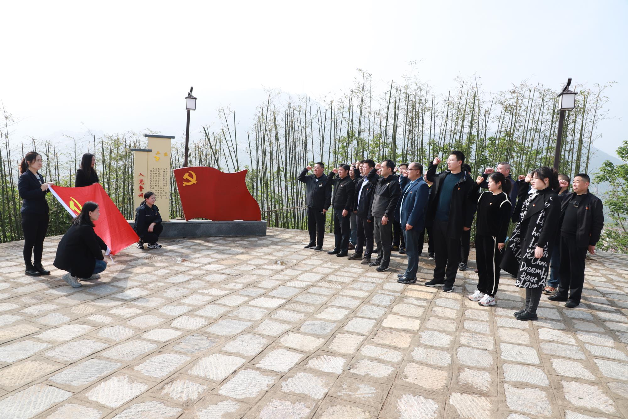 在白虎山山頂“海曙亭”里,黨委書記、總經(jīng)理趙立喜介紹了1928年中共東海特別支部成立的那段光輝歷史,并講解了李超時(shí)、惠浴宇、小葉的革命事跡。隨后又帶領(lǐng)大家重溫入黨誓詞,黨員們參觀了山上的建黨紀(jì)念亭、紀(jì)念碑與翹石下的中共東海特別支部成立時(shí)會議舊址。