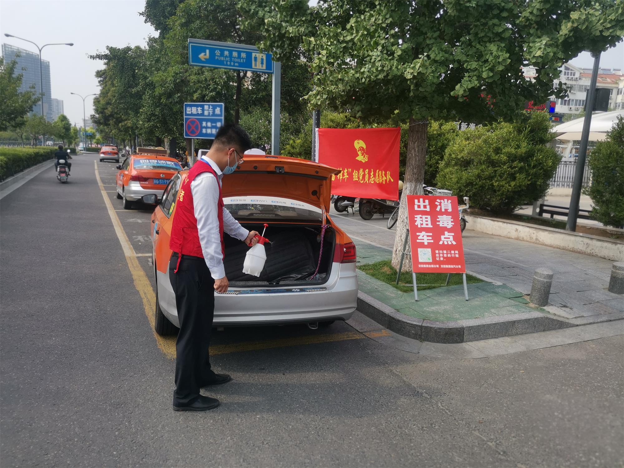 8月8日,出租汽車事業(yè)部黨總支積極行動起來,在各消殺點位懸掛“雷鋒車組”黨員志愿服務(wù)隊旗幟,事業(yè)部院內(nèi)懸掛防疫宣傳橫幅,并在當(dāng)天制作100張防疫標(biāo)貼張貼在品牌車隊及部分營運(yùn)出租車輛上。