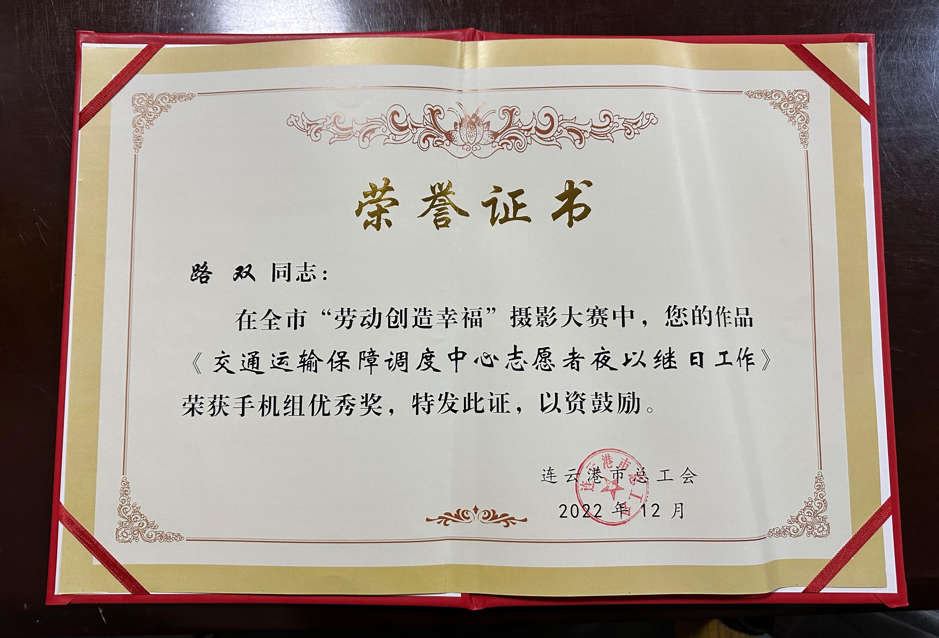 歷時六個月,經(jīng)過評委評審,出租汽車事業(yè)部路雙同志攝影作品《交通運輸保障調(diào)度中心志愿者夜以繼日工作》獲手機(jī)組優(yōu)秀獎。